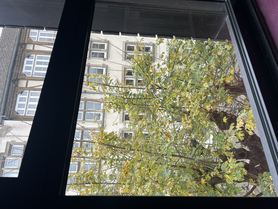 The image depicts an exterior view framed by a dark window pane, suggesting a perspective from an indoor room in Strasbourg, France. A thick, multi-branched tree dominates the center and lower-left, its leaves displaying a mix of green and yellow, indicative of late summer or early autumn. The tree's main trunk is gnarled and dark. In the background, two buildings are visible under an overcast sky. The lower building features a light-colored, possibly stuccoed, facade with numerous evenly spaced rectangular windows, each having white frames and stone or white surrounds. Above and behind this structure, the upper portion of a distinct building is visible, characterized by its traditional half-timbered architectural style. This upper building has a dark tiled pitched roof and features several large, ornate arched window openings, each containing multiple white-framed panes, set within dark timber framing. No people or specific actions are discernible.
