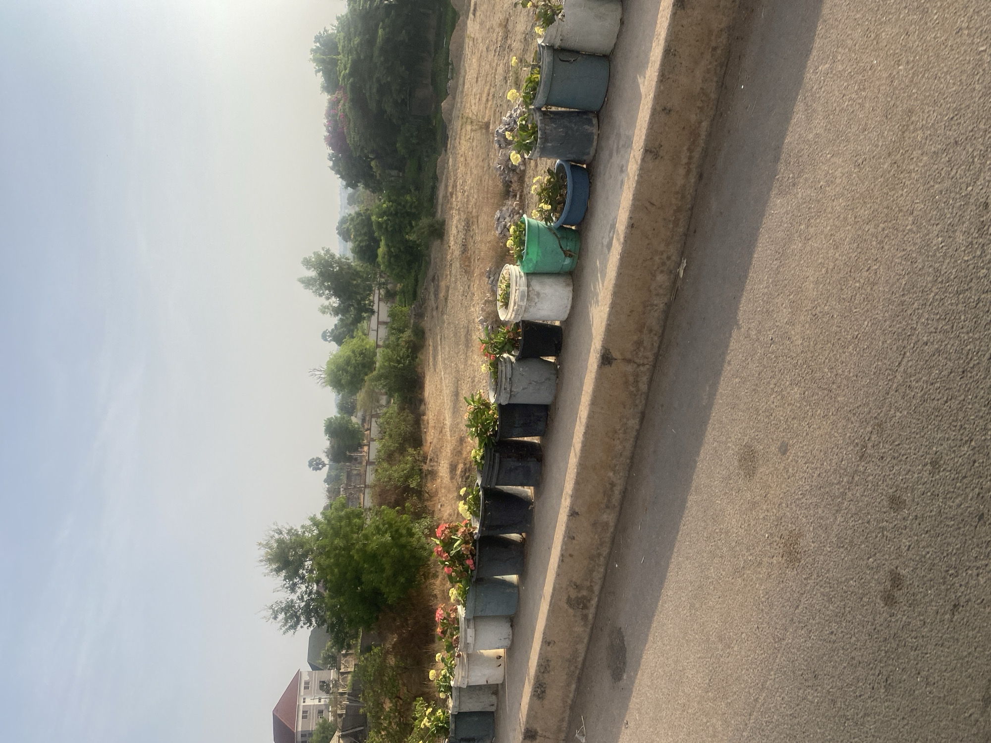 The image depicts a roadside scene in Rido, Nigeria, under a hazy sky. In the foreground, an asphalt road with visible wear and faint stains runs horizontally, bordered on the right by a concrete curb. A shadow from an unseen structure or object extends diagonally across the road from the right. Along the elevated dirt verge behind the curb, a row of approximately sixteen repurposed buckets and planters holds various flowering plants. These containers vary in color, including white, gray, black, green, and blue. The plants display primarily yellow and pink-red flowers, with green foliage. Behind this planted strip, an undeveloped expanse of dry, light-brown earth with sparse vegetation extends into the midground. In the background, a dense line of green trees and shrubs forms a natural barrier. Further left, a multi-story residential building with a red roof and light-colored exterior walls is partially visible among the trees. The distant landscape appears rural, with additional trees under a pale, diffused sky. No individuals or active interactions are present in the scene.