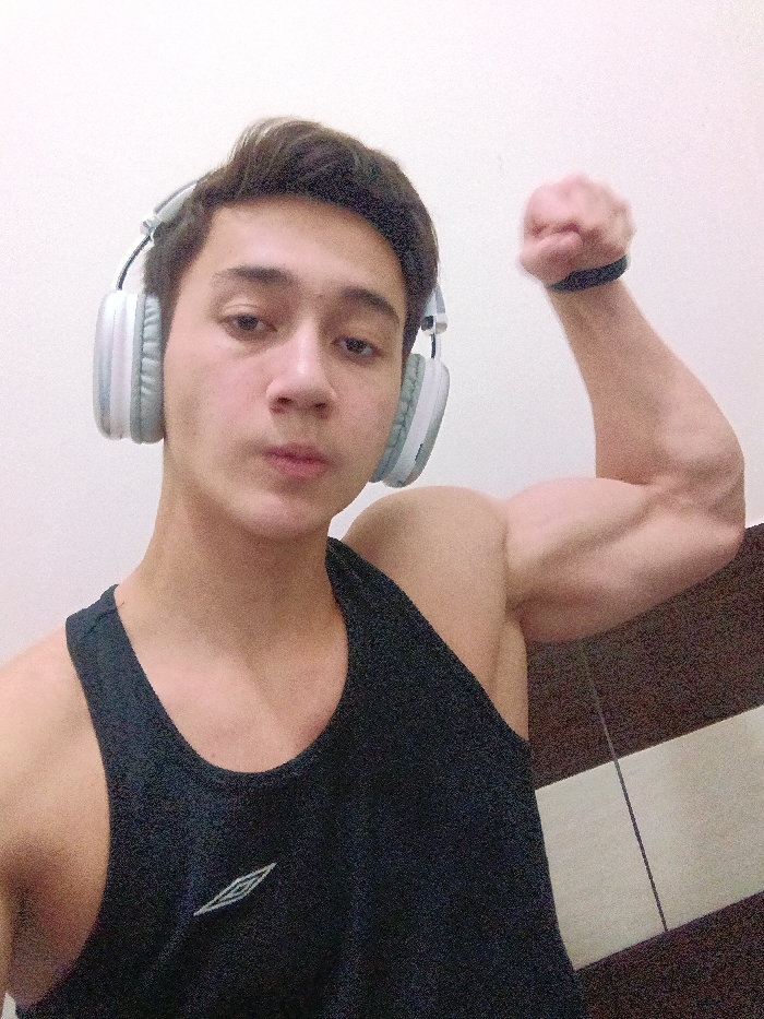A young adult male is depicted in a close-up, chest-up shot, indoors. He has light skin, short dark hair, and is wearing white and light blue over-ear headphones. His attire includes a black sleeveless tank top with a small white, diamond-shaped logo on the left chest. The male is flexing his right bicep, with his fist clenched, and a black wristband is visible on his right wrist. The background consists of a plain, light-colored wall, with a dark brown and white two-toned panel or furniture piece partially visible on the right side of the frame. The scene is located in the city of Chaikovsky, Russia.