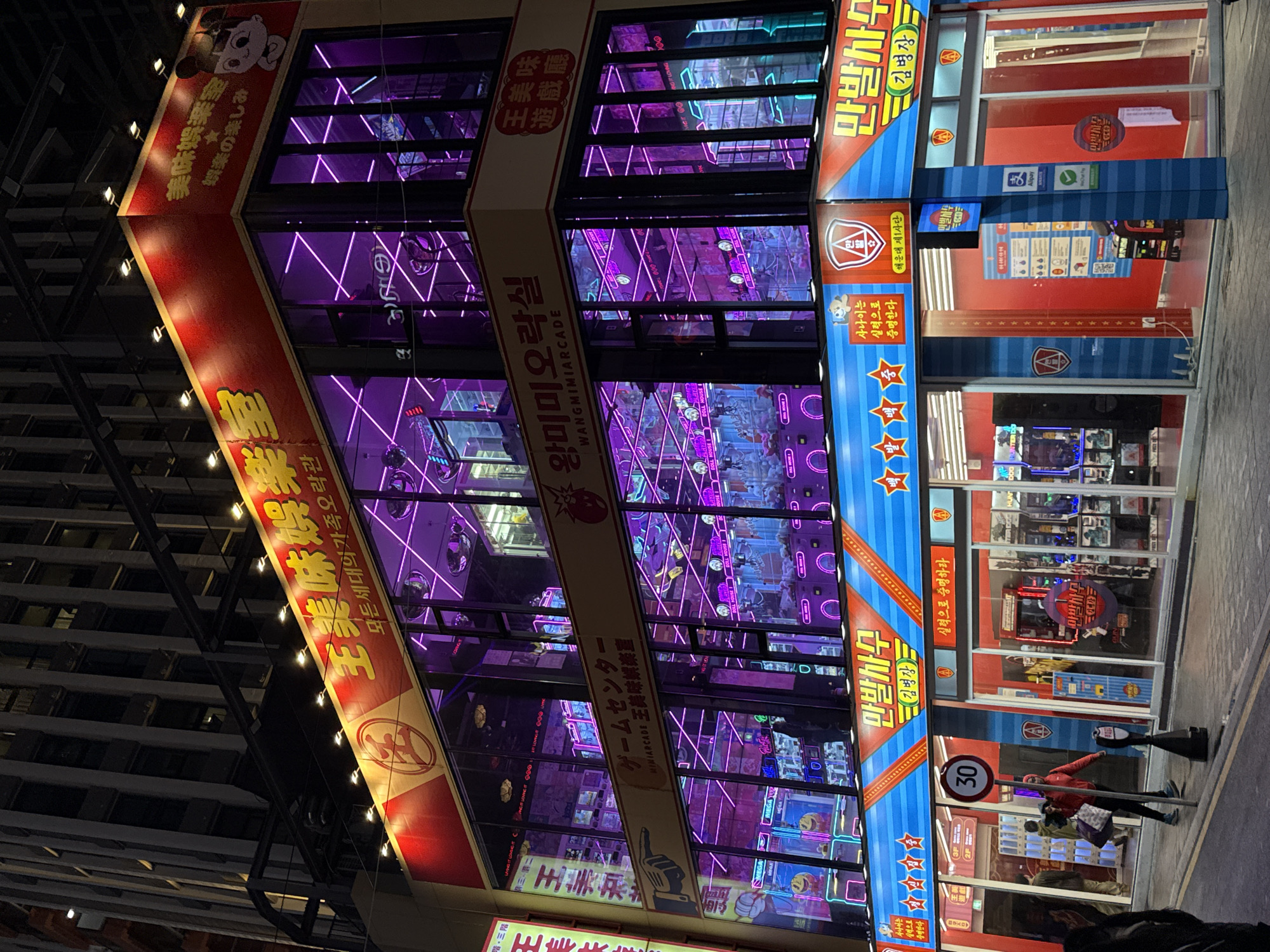 A three-story building in Busan, South Korea, is prominently marked with brightly colored and illuminated signs in Korean and other languages. The building appears to be an arcade called "WANGMIMIARCADE," or "Wang Mimi Arcade." The interior is illuminated with purple neon lights and arcade games. Two individuals are standing outside the arcade. A speed limit sign of "30" is also visible. The building is adjacent to a taller structure, possibly another building.