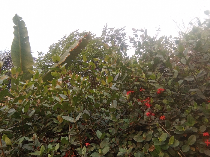 Lush greenery fills the frame, dominated by a dense bush with clusters of small, vibrant red flowers scattered throughout. A large, elongated banana leaf stands prominently on the left, partially obscuring a second leaf behind it. Behind the foreground bush, other trees and foliage blur together under a bright, overcast sky. The scene evokes a tropical or subtropical setting, with abundant plant life.