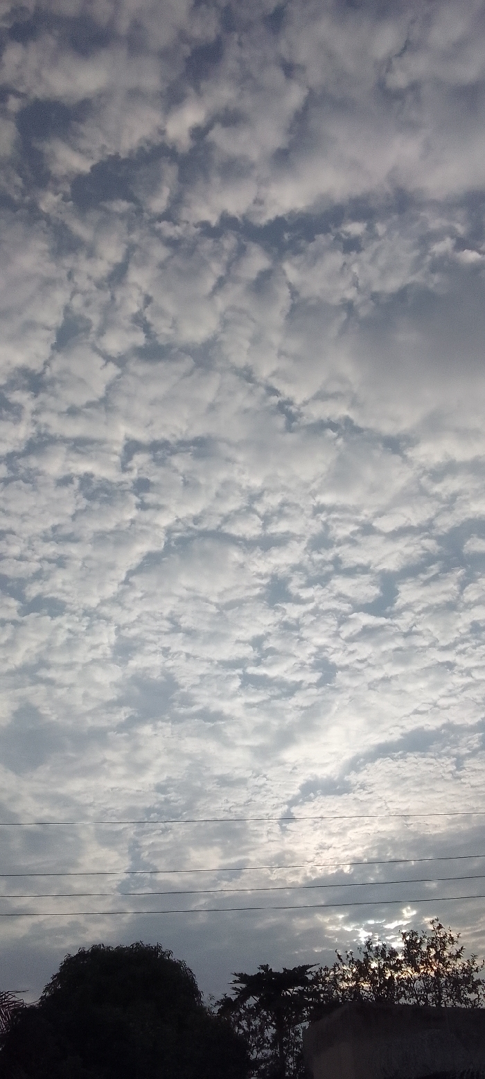 The image captures a sky densely populated with altocumulus clouds, creating a textured and ethereal feel. Glimmers of sunlight peek through the cloud gaps near the horizon, adding brightness to the otherwise overcast scene. Silhouetted trees and power lines occupy the lower portion, grounding the airy expanse above. Overall, the image conveys a serene and tranquil atmosphere.