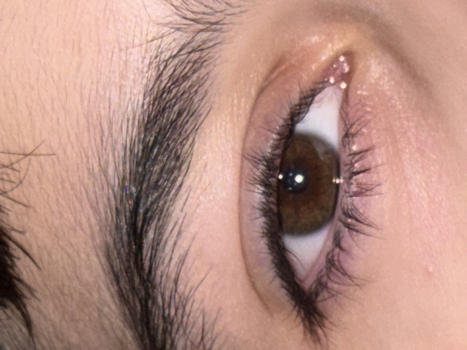 The scene depicts an extreme close-up of a human eye, specifically the right eye. The iris is a medium brown with a clearly defined, round pupil that reflects two distinct specular highlights, one large and spherical near the top-center, and a smaller, elongated one towards the bottom. Dark, individual eyelashes are prominent, densely distributed along the upper lid and sparsely along the lower lid. The eyebrow is thick and dark, positioned above the eye, with some fine hairs visible extending onto the forehead. The skin surrounding the eye is light-toned, exhibiting visible pores and subtle fine hairs. Notably, a cluster of small, reflective, pink-hued glitter particles is applied to the skin at the inner corner (medial canthus) of the eye, with a few dispersed glitter particles also visible within the eyebrow. The lighting appears direct, highlighting the glitter and the specular reflections in the pupil. No background details are discernible beyond the immediate facial area. The location is in the city of Saint-Étienne, France.