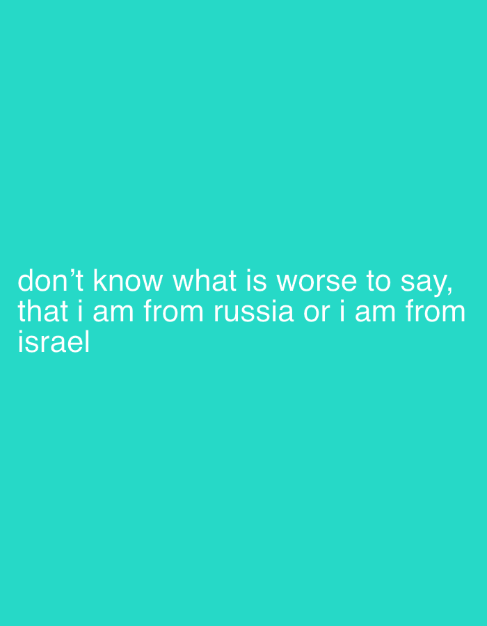 The image displays white, sans-serif text against a solid teal-colored background. The text reads: "don't know what is worse to say, that i am from russia or i am from israel". The text is positioned in the lower-left portion of the frame. There are no depicted people, physical subjects, objects, actions, or interactions. The environment is a digital, monochromatic color field. The image provides no visual information to determine a specific geographical location within Pardes Hana-Karkur, Israel, or any other city.