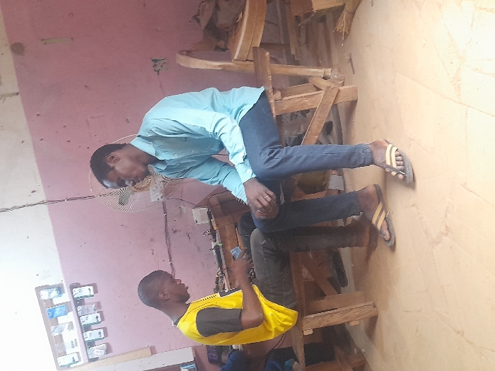 Two men are in a room, seemingly engaged in a woodworking project. One man wears a yellow shirt and sits on a stool, holding an object in his hand. The second man, wearing a blue shirt, leans over him. Behind them are woodworking pieces and chairs. A fan is visible on the wall. The room's walls are painted in hues of pink and tan. The lighting in the room is bright.