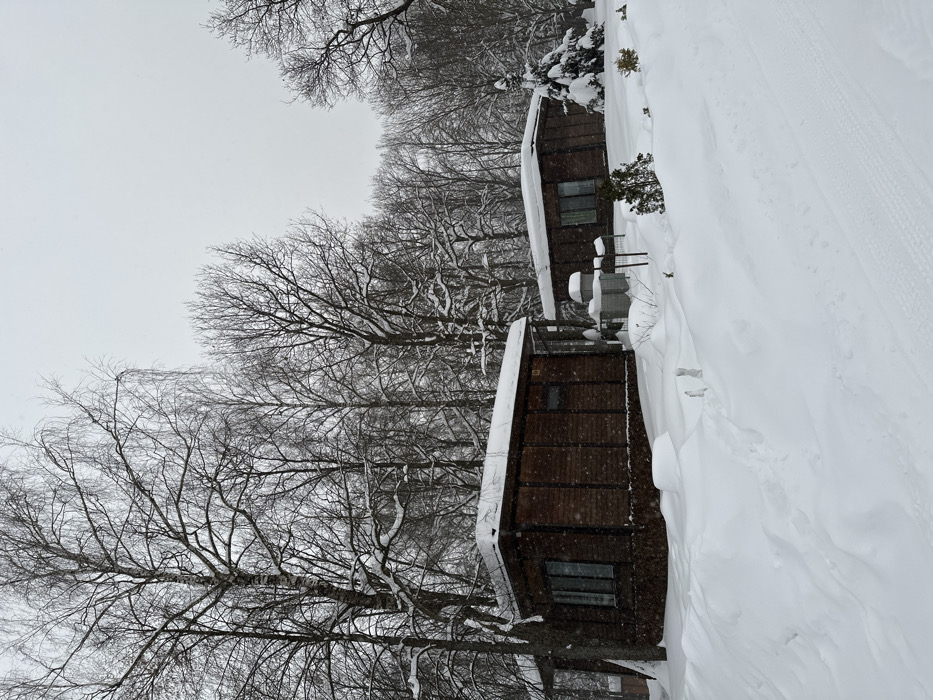 The image displays a winter landscape in Prokhorovo, Russia, under an overcast, light gray sky with active snowfall. Two single-story, dark brown structures, resembling cabins with horizontal siding, are prominent. The building on the left features a flat roof heavily covered in snow, with two rectangular windows visible on its facade. The building on the right is positioned further back and to the right, exhibiting similar construction with a snow-laden roof and a single visible rectangular window. The ground is uniformly covered in deep, white snow. Faint tracks are visible in the snow in the lower right foreground, possibly tire marks. Additionally, faint footprints are observable in the middle foreground, leading towards the left structure. Between the two buildings, two outdoor utility units, possibly HVAC components, are visible on elevated frames, partially covered in snow, along with a small metal fence. Several small evergreen bushes, including a conical one heavily dusted with snow, are interspersed in the snow-covered ground between and around the structures. The background is dominated by a dense array of bare deciduous trees, including identifiable birches, with their branches coated in snow, indicating a winter setting. No people are visible.