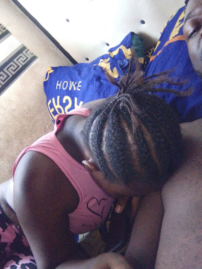 A child wearing a pink tank top with a heart design leans her head down, her dark hair styled in braids gathered into a ponytail on top of her head. She is next to an adult. The pillow behind them is blue and gold with the word "HOME." A patterned rug is visible on the left side.
