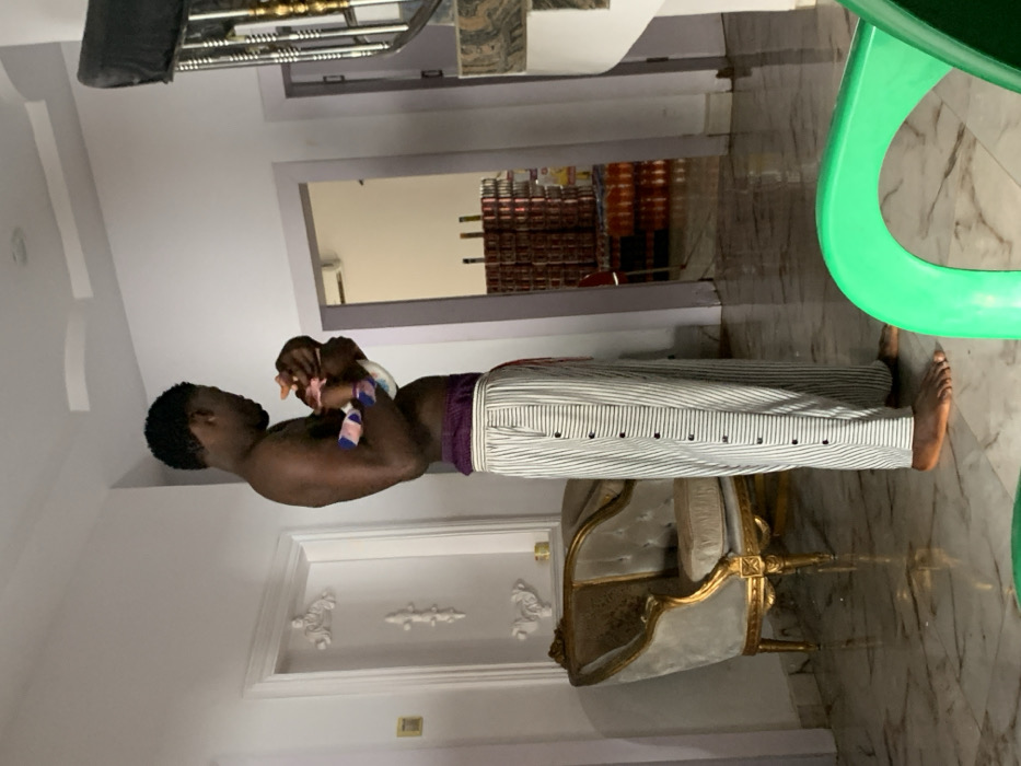 An adult male stands barefoot on a light-colored tiled floor, holding an infant. The male is shirtless, wearing vertically striped loose-fitting pants with side buttons and visible purple undershorts. The infant, dressed in a patterned garment and striped socks, is cradled in the man's arms. The scene is indoors, within what appears to be a residential or mixed-use building in Aguleri, Nigeria. To the immediate left of the male is an ornate, gold-framed armchair with light upholstery. The wall behind features decorative white molding around a doorway. In the lower right foreground, a portion of a bright green plastic chair is visible. An open doorway in the background reveals an adjacent room containing numerous stacked cases of canned goods, primarily red and silver, and several cases of beverages in clear plastic bottles with orange liquid. An air conditioning unit is mounted above this doorway. A partial view of a staircase railing with metallic elements is present on the far right. The ceiling is white with subtle architectural indentations.