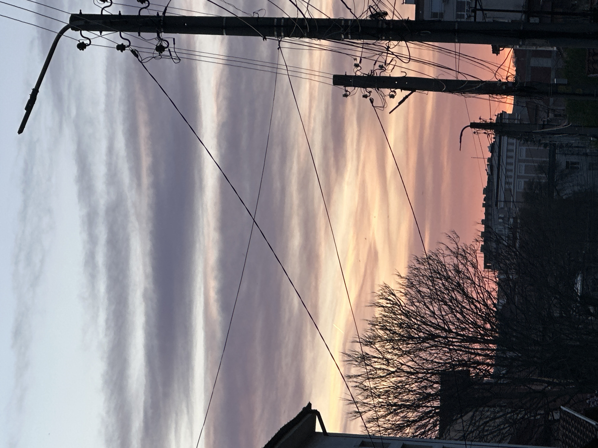 view in Harmanli, Bulgaria, looking east at sunset. The sky is filled with long, striated clouds in shades of gray, purple, and orange. In the foreground are utility poles with numerous wires crisscrossing the view. A leafless tree branch is silhouetted against the sky in the lower right. A few buildings are visible in the background, including apartments. The picture is taken from a low angle. The building roof in the bottom is residential.