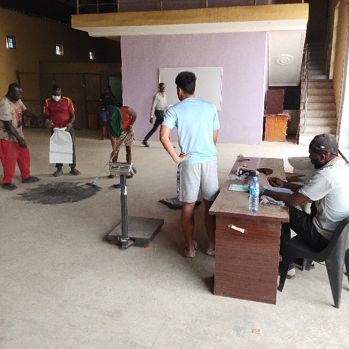 An indoor scene shows several people engaged in various activities. Three individuals, one wearing a face mask, stand near a spill, one holding a bag and another sweeping. Further back, another person walks by. A man in a light blue shirt stands near a table where a seated individual is focused on a task. A water bottle sits on the table. A scale is visible near the center. In the background, stairs lead to an upper level. The building has several small windows.