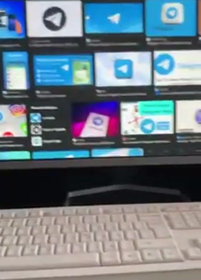 A close-up shot shows a computer monitor displaying an image search for "Telegram" with numerous results of the Telegram logo and related images. In front of the monitor is a white keyboard. The setting appears to be indoors, on a desk. Loud voices can be heard in the background.
