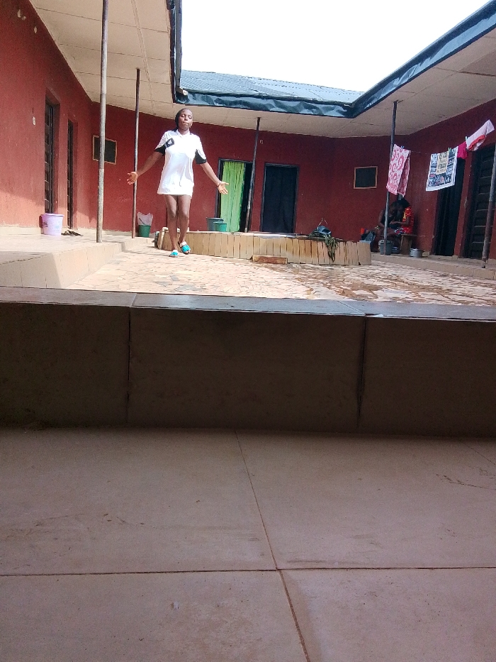 The image depicts a residential or communal courtyard located in Agbor, Nigeria. The scene is dominated by a central paved area with visible wet patches on the ground. Surrounding this area are reddish-brown painted walls with multiple dark, rectangular doors leading into interior spaces. An overhead roof structure, supported by slender dark poles, extends inwards, forming a covered veranda. In the center of the courtyard, a young adult Black female stands facing the camera. She wears a white, short-sleeved dress with black trim on the shoulders and light blue slip-on sandals. Her arms are extended slightly outwards with open palms. To the right side of the courtyard, another individual, dark-skinned and dressed in dark clothing, is seated on a low bench or stool against the wall, partially obscured by a support pole and hanging laundry. Several items of clothing, including red, white, and patterned fabrics, are strung on a line between support poles for drying. Near the seated figure, various containers and objects are visible on the ground. On the left side of the courtyard, a pink bucket rests near one of the dark doors, and a green bucket is positioned closer to the center. The foreground shows a low, wide, light-colored tiled ledge or wall, separating the viewer's perspective from the courtyard floor. The sky is visible above the roofline, indicating an outdoor, daytime setting with bright, diffused light.
