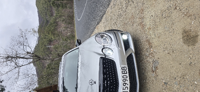 - "A silver Mercedes-Benz E-Class (W211 generation) is prominently featured in a front-right quarter view, parked on a dirt and gravel shoulder next to a wet, curved asphalt road" by FM-OUQug1, licensed under CC BY 4.0