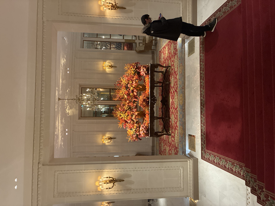 The image depicts the opulent interior of Le Bristol Paris, specifically a grand hallway or antechamber. In the foreground, a wide staircase covered in a crimson red carpet with a green and gold floral border descends onto a polished white marble floor. Beyond the marble, a large, intricately patterned red and blue rug covers the main floor area. Centrally positioned in the midground, a long, dark wooden console table with ornate legs supports multiple elaborate floral arrangements. These arrangements consist of abundant flowers in vibrant autumnal hues, primarily reds, oranges, yellows, and pinks, presented in large, golden-toned vases. The walls are cream-colored, featuring classical architectural elements such as fluted pilasters, recessed panels with intricate moldings, and ornate gold-finished, multi-arm wall sconces with candle-like bulbs. An arched doorway in the background reveals another opulent space, with a prominent crystal chandelier reflecting in a large wall mirror. Another crystal chandelier hangs from the ceiling in this background area. To the far right in the background, a traditional beige upholstered armchair is partially visible within an adjoining room. On the right side of the image, standing on the white marble floor, is a single male individual. He is wearing a dark winter jacket with a fur-lined hood, dark trousers, and dark athletic shoes with white soles. He is facing left, looking down intently at a smartphone held in both hands. The scene is illuminated by warm, artificial lighting sources, including the wall sconces, chandeliers, and recessed ceiling lights.