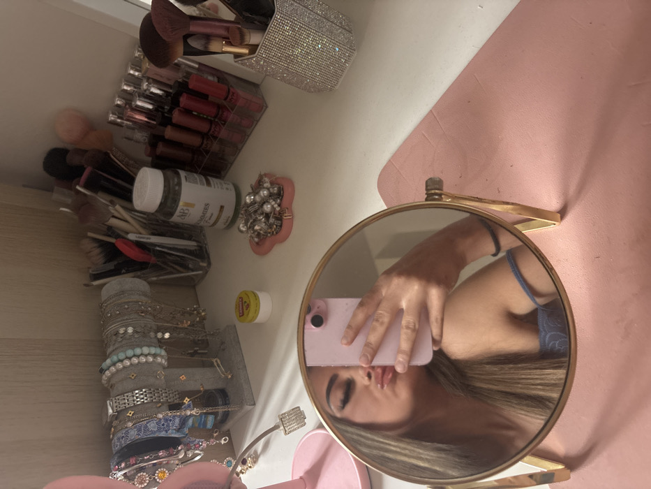 The image displays an indoor scene on a white vanity or desk surface in the city of Erstein, France. The central focus is a round, gold-framed tabletop mirror reflecting a female individual taking a selfie with a light pink smartphone, held by her right hand. Her lips are pursed in a "kiss" expression, and she exhibits long, highlighted hair and visible eye makeup. A blue strap from her attire is visible on her right shoulder. On the white surface, from left to right, a pink stand with a sparkling accessory is positioned near a grey T-bar jewelry organizer holding various bracelets and necklaces. A small, yellow-lidded container is placed centrally. Further to the right, a green-tinted bottle labeled "AB GUMMIES Femme" stands beside a pink, flower-shaped dish containing small, shiny accessories. The right side of the surface features multiple cosmetic organizers: a clear container filled with assorted makeup brushes, an acrylic organizer holding rows of lip products (some identified as NYX), and a sparkling, U-shaped container housing additional makeup brushes. A pink mat is situated beneath the mirror. The background consists of a light, neutral-colored wall or cabinet interior.