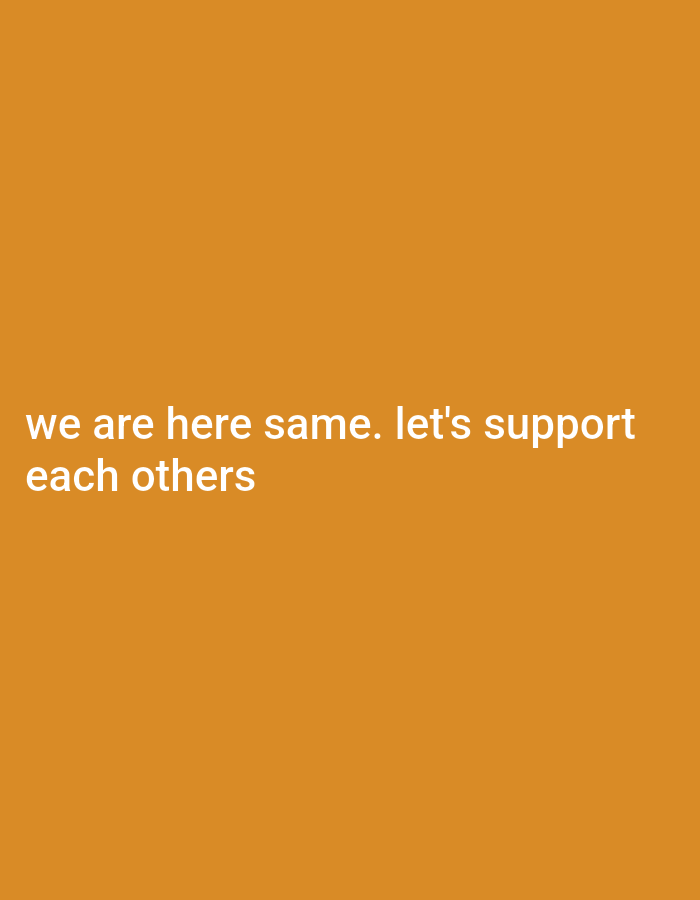 The image displays white text set against a solid orange background, located in the city of Mns Alue, Indonesia. The text, rendered in a sans-serif font, is positioned in the lower-left section of the frame and reads: "we are here same. let's support each others". No discernible individuals, specific objects, actions, interactions, or detailed environmental features are present; the scene is purely graphic.