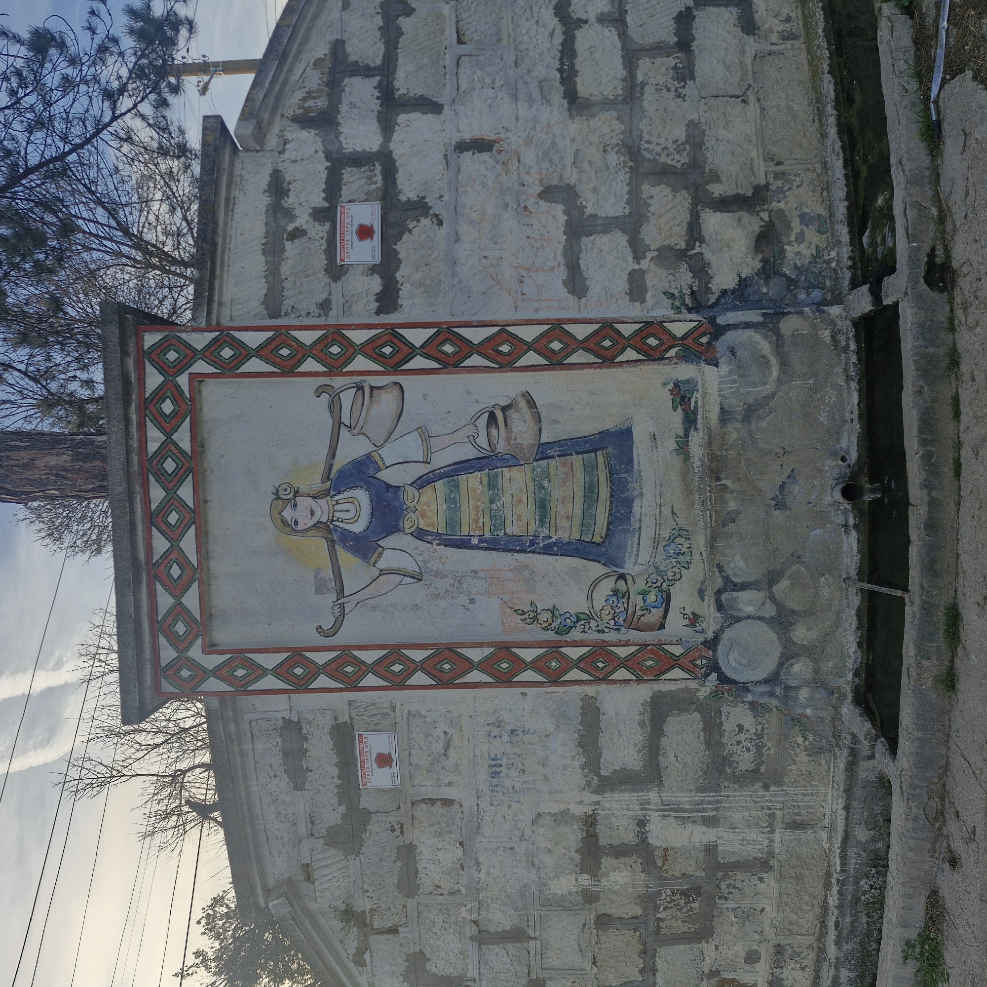 stone structure, likely a public fountain, located in Sennik, Bulgaria. A large, rectangular mural depicting a woman in traditional Bulgarian clothing carrying water jugs is prominently featured. The mural is framed with a decorative border of repeating diamond shapes in red, green, and white. The woman has a halo, suggesting a religious or cultural significance. The water jugs appear to be clay. A water trough is visible, with an active water spout. The stone surface of the structure is aged and weathered. A small, rectangular sign in Bulgarian with a red emblem is affixed to the structure above the mural. Some utility lines are also visible in the sky.