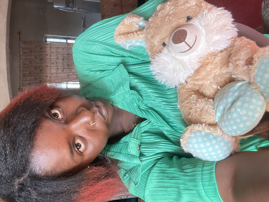 - "A person with dark hair and red highlights smiles slightly while holding a light brown stuffed bear with white fur around its face" by FM-nrUyz2, licensed under CC BY 4.0