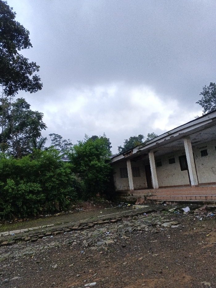 A dilapidated building with a covered walkway stands alongside overgrown greenery. The structure has weathered walls, faded paint, and a damaged roof. The paved ground in front is uneven and strewn with debris. Overcast skies dominate the scene, creating a muted and somber atmosphere. Trees are visible in the left-hand corner.