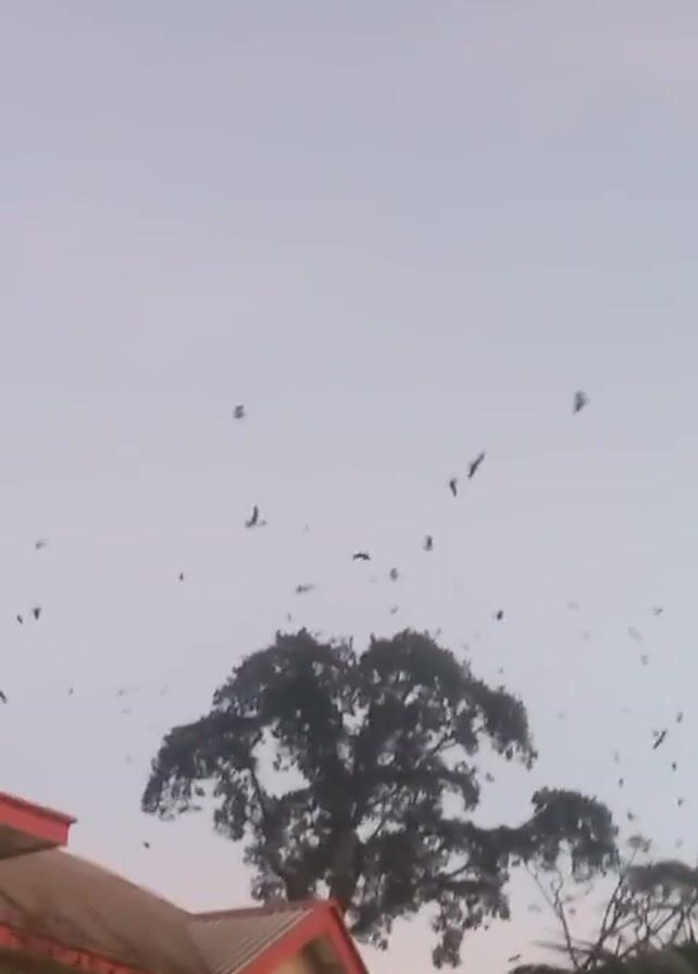 twilight sky filled with numerous birds in flight. Below the sky, silhouetted trees and a building with a red roof are visible. Utility poles and wires also appear in the foreground. The scene is still, with the primary action being the movement of the birds against the changing sky.