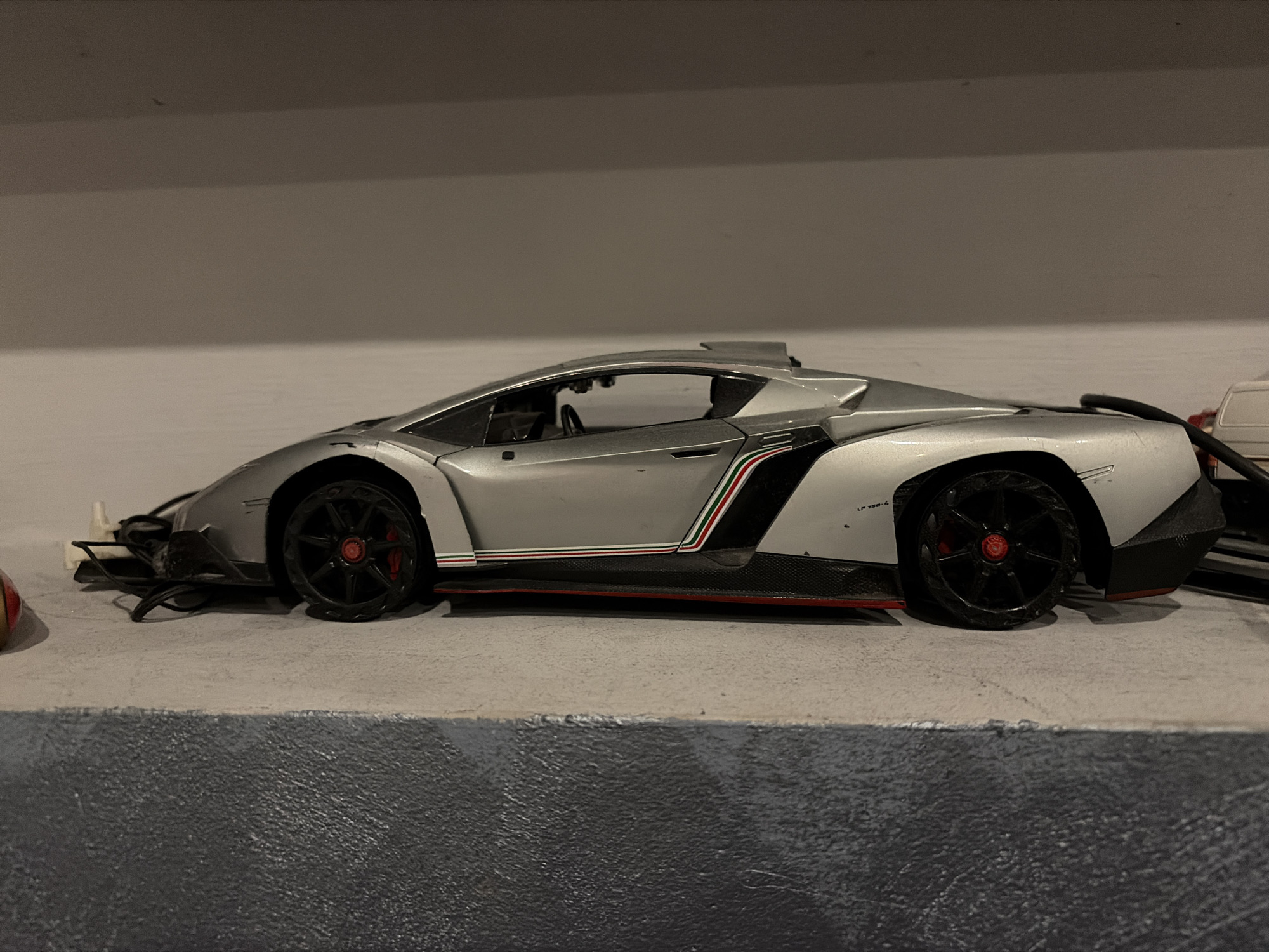 - "silver Lamborghini Veneno diecast model car sitting on a shelf" by FM-uQTN23, licensed under CC BY 4.0