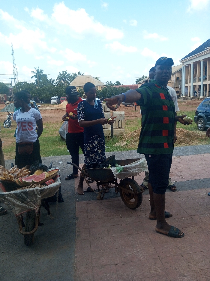 The image portrays an outdoor scene in Ajalli, Nigeria, under a partly cloudy sky. The foreground consists of a reddish-brown patterned paved walkway transitioning to an unpaved, dusty area. Two wheelbarrows are present. The left wheelbarrow contains various fruits, including sliced watermelon and bananas, partially covered by a white cloth. The right wheelbarrow is mostly empty, containing a white sack. Four primary individuals are visible. In the foreground right, a male wearing a dark green and red striped polo shirt, dark shorts, dark slide sandals, and a dark baseball cap holds a pale green fruit in his right hand while extending his left index finger. To his immediate left and slightly behind, a female wearing a dark blue dress with a white floral pattern, barefoot, holds a similar pale green fruit. Behind her, a male in a red t-shirt, black pants, and a dark baseball cap with "NYPD" lettering holds a yellow fruit. Further left, a female wearing a white t-shirt with "Say YES" printed on it and dark lower attire, with a pouch around her waist, stands facing left. Other indistinct figures are visible in the background. The background features multiple structures. On the far right, a large light-colored multi-story building with classical-style columns and balconies is prominent. Other less distinct buildings are visible further back. Vehicles include a motorcycle on the far left, a white van in the mid-ground, and a dark blue SUV parked on the far right. Piles of concrete blocks are present in the mid-ground. A tall metal communication tower is visible on the far left, and palm trees along with other vegetation are scattered throughout the background.