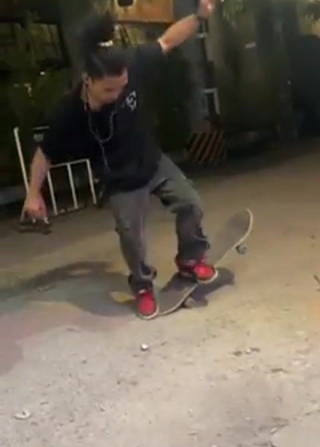 young man wearing a black t-shirt, grey cargo pants, and red sneakers performing a skateboarding trick on a paved street. He also has his hair up in a bun and is wearing a chain necklace. The man successfully lands the trick, stopping the skateboard beneath his feet. The environment is dimly lit, suggesting it is nighttime. In the background, there is a sign, a wooden post with hazard stripes, and foliage. The surface of the street appears cracked.