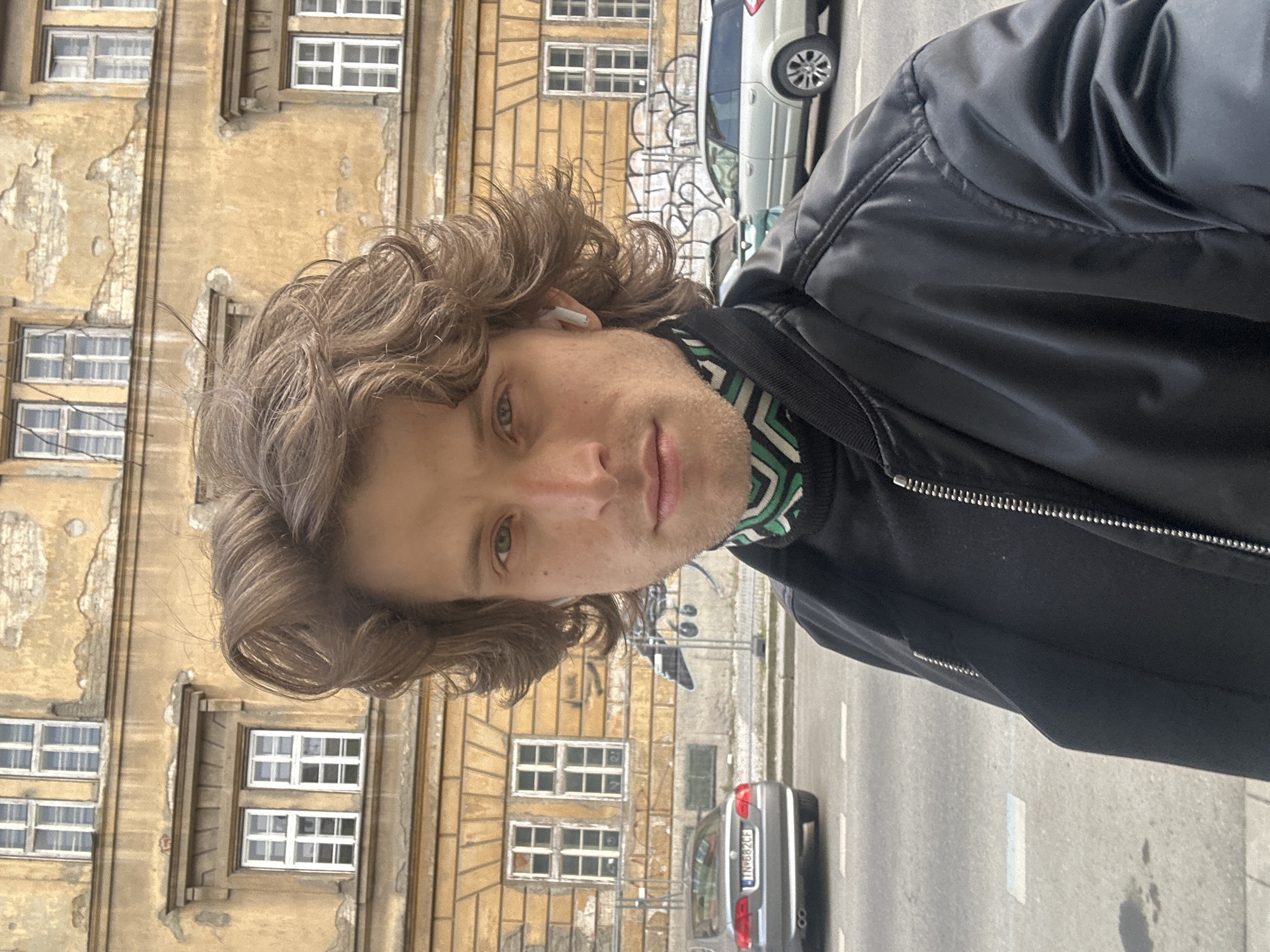 A medium-shot photograph features a Caucasian man in the foreground wearing a black bomber jacket, black sweater, and green and white patterned scarf. He has light brown, curly hair and is wearing an earbud in his left ear. The background shows a building with a yellow facade and multiple windows with white frames. There is graffiti on the wall of the building. A street is visible to the right, with a silver car and a light-colored car parked. Based on the architectural style of the buildings, this is a photograph taken in Prague, Czechia.