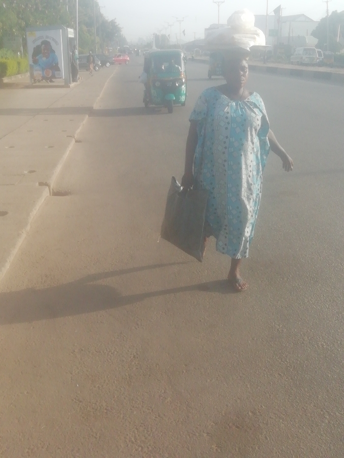 A woman walks on an asphalt road with a bag in her left hand and items balanced on her head. She wears a light blue patterned dress and sandals. The scene is outdoors, possibly in an urban area, with a billboard, vehicles, and other people visible in the background. The photo appears to be taken during the day, but the sky is hazy or foggy, casting a shadow from the woman towards the bottom left of the frame.