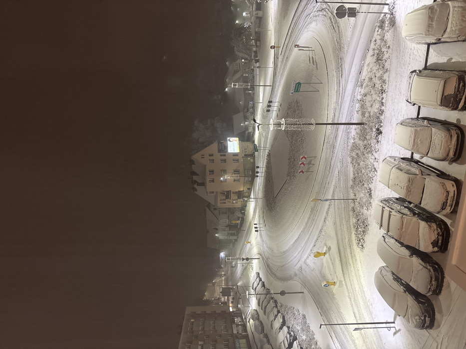 Snow blankets a nighttime urban landscape. Roads and parked cars are thickly covered. A roundabout dominates the scene, illuminated by streetlights. Buildings line the street, one featuring a lit billboard. The sky is dark and overcast, contributing to the wintery atmosphere. The viewpoint appears elevated, offering a comprehensive view of the snow-covered town.