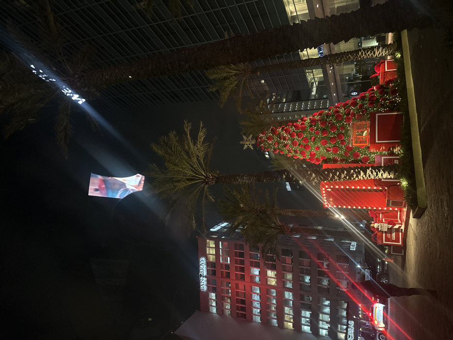 A night scene showcases a tall Christmas tree adorned with red ornaments and illuminated with lights, positioned beside a building labeled "Hilton." A smaller structure near the tree is also illuminated with red lights. Palm trees frame the scene, with a spotlight shining upward onto a screen projecting an image in the dark sky. The building "BANOBRAS" is visible in the background.