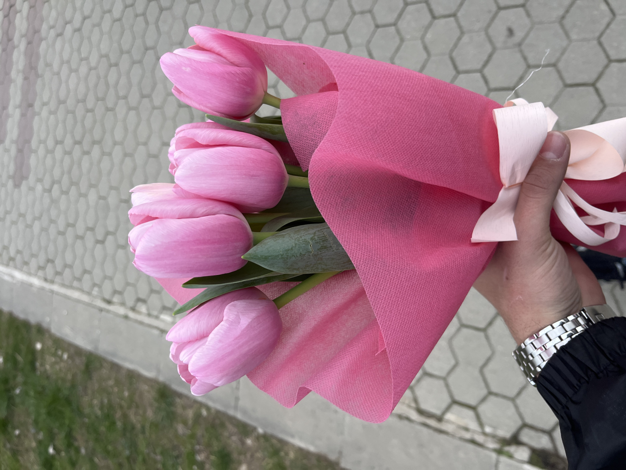 A person's right hand holds a bouquet of six light pink tulips wrapped in a bright pink non-woven fabric, secured with a light pink satin ribbon tied in a bow. The hand is visible from the wrist down, wearing a silver-toned metal link watch on the left wrist and a dark-colored jacket sleeve. The bouquet is held in an upright position. The background consists of an outdoor paved surface made of grey hexagonal interlocking pavers, a narrow curb, and an adjacent strip of sparse green grass and dirt. The scene takes place in Sofia, Bulgaria, outdoors on what appears to be a sidewalk or pedestrian area.
