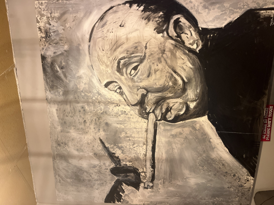 A large, vertically oriented, monochromatic artwork is displayed on an interior wall in Palma, Spain. The painting, rendered in black, white, and sepia tones with visible brushwork and textural splatters, depicts the head and upper torso of a dark-skinned man in profile, facing upwards and to the right. A prominent cigar extends from his mouth, on which a dark-colored bird with spread wings is perched. The man wears a dark turtleneck. Below the bottom edge of the artwork, a red rectangular sign with white text reads "SE RUEGA NO TOCAR" and "PLEASE DON'T TOUCH". Above the painting, a plain light-colored wall transitions to a light brown, paneled ceiling.