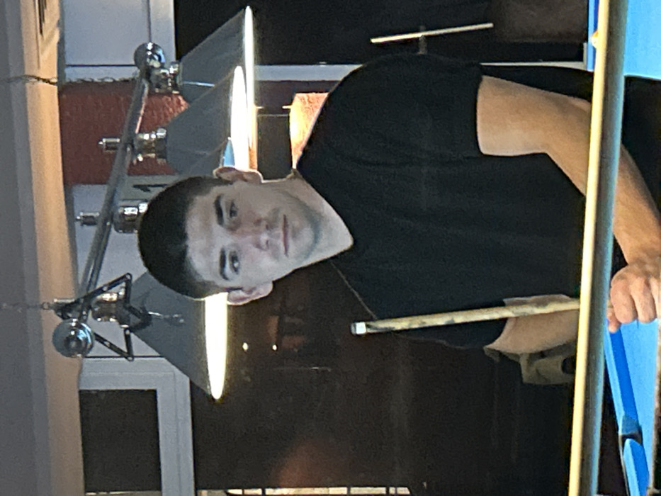 An interior scene depicts a male individual within a commercial establishment, likely a billiards hall, located in Sliven, Bulgaria. The subject is a young adult male with short, dark hair and a light complexion, dressed in a plain black v-neck t-shirt. He is positioned behind a pool table, looking directly at the camera with a neutral expression. His left hand holds a wooden pool cue vertically, resting against his left side, while his right forearm is supported by the light-colored wooden rail of the table. The table features a blue felt playing surface. Overhead, a metallic fixture with multiple conical lampshades emits bright white light, illuminating the subject and the table. The background is dimly lit and out of focus, showing dark surfaces and a partial view of a reddish-brown wall or pillar behind the subject.