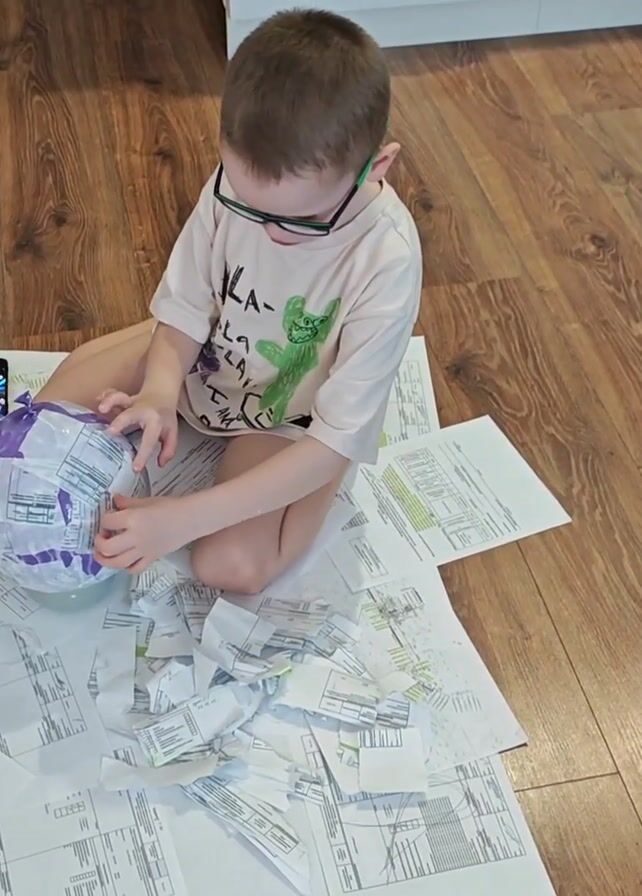 A young boy with glasses sits cross-legged on a wood-look floor. He is surrounded by paper, some torn and some intact, and is working on a round object covered in paper strips. A phone is nearby, displaying a cartoon image on its screen. The boy's shirt features a green design. A gray couch is visible in the background.