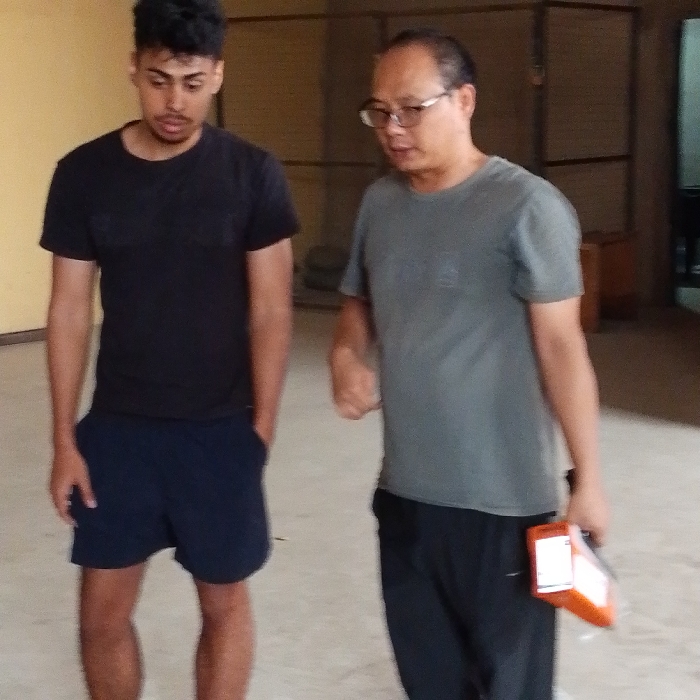 Two men are in a room. A young man, wearing a dark t-shirt and dark blue shorts, stands with his left hand in his pocket. Beside him stands an older man with glasses, a gray t-shirt, and black pants. The older man is gesturing with his right hand and holding an orange device in his left. The room appears to be a large, open space with a concrete floor.
