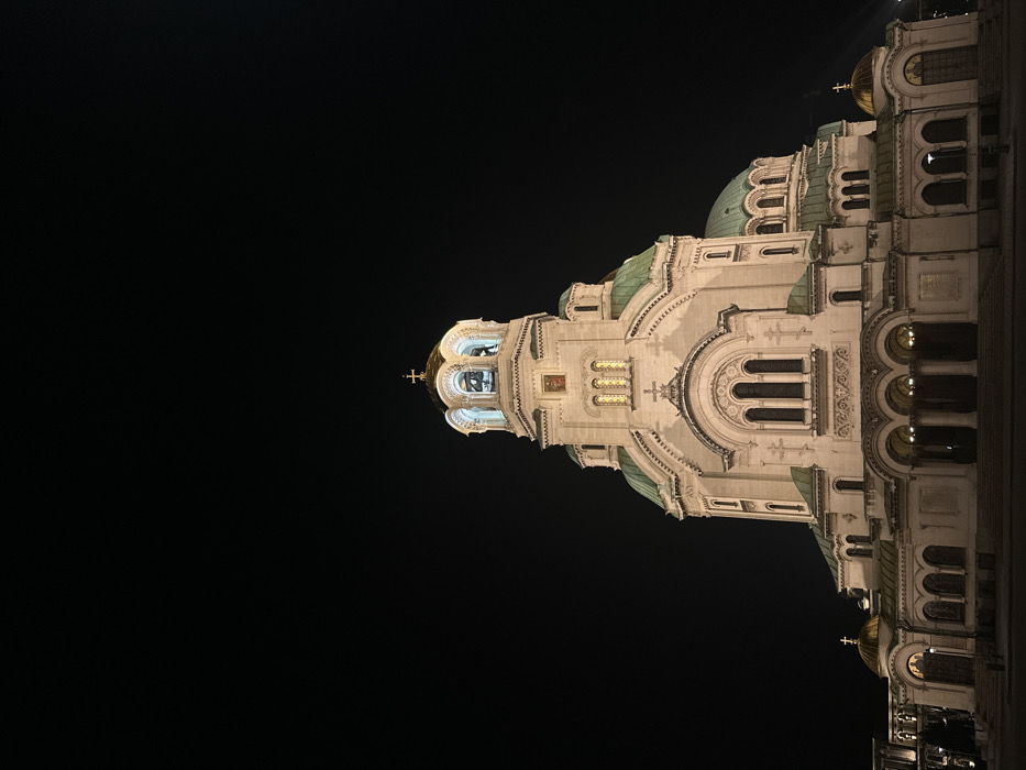A night image captures the St. Alexander Nevsky Cathedral in Sofia, Bulgaria, illuminated against a completely dark sky. The cathedral, a large, light-colored stone structure exhibiting Neobyzantine architectural elements, occupies the central and lower portions of the frame. Its prominent features include a central bell tower with an open belfry housing bells, crowned by a gilded dome and cross. Numerous other domes are visible, some gilded and others displaying a verdigris (patina green) finish. The facade is detailed with arched windows, decorative carvings, and a multi-arched main entrance supported by columns. The building is evenly lit by artificial warm-toned lights, highlighting its architectural details. The foreground consists of a dark, unadorned surface, likely a pavement or square. No individuals, vehicles, or discernible activities are present in the scene.