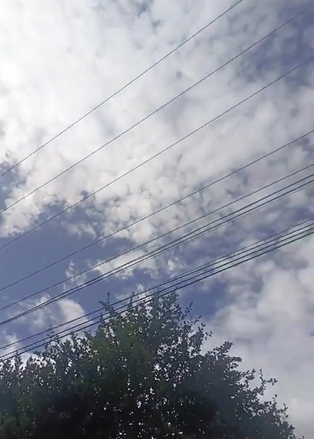 view of the sky from below, framed by the branches of a tree and crossed by several power lines. The sky is a mix of blue and white, with fluffy clouds scattered throughout. The camera moves slightly, shifting the perspective of the clouds and revealing more of the blue sky in certain areas.