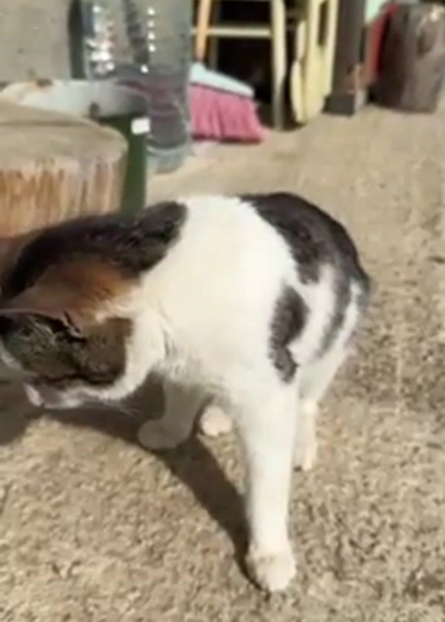 A white and gray tabby cat stands on a concrete surface, looking up. Various objects are visible in the background: a plastic water bottle, wooden stools, a pink broom, and a tree stump. The scene appears to be outdoors on a sunny day.