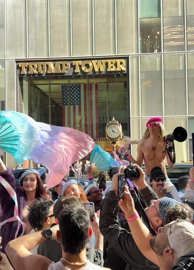 The video captures a daytime demonstration in front of Trump Tower