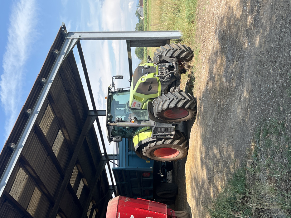 The image displays an agricultural setting in Eschau, France, on a clear day with a blue sky and sparse white clouds. A large, lime-green and black CLAAS Axion 850 tractor is centrally positioned under a metal-framed shed with a corrugated roof, its tires resting on a gravel surface partially illuminated by sunlight and partially in shadow. A dark blue, multi-axle agricultural trailer is hitched to the rear of the tractor, extending into the darker area beneath the shed's left side. A portion of a red farm implement is visible on the far left, also under the shed's cover. Beyond the shed's open side, a field of tall green and brown vegetation stretches towards a distant horizon featuring faint buildings, trees, and what appear to be low-lying hills or mountains. No individuals are present in the scene, and all visible machinery is stationary.
