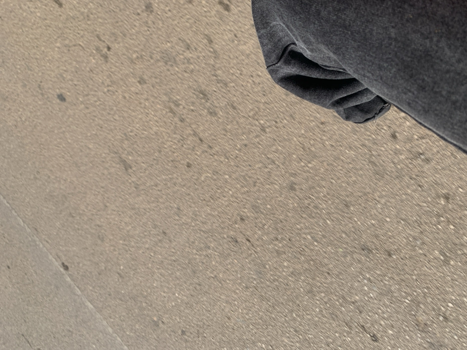 A gray, textured surface dominates the left and lower portions of the image, possibly asphalt or concrete. In the upper right, a section of dark gray fabric, likely clothing, is visible. The fabric is folded and has a soft, textured appearance. The contrast between the smooth surface and the folded fabric draws attention.