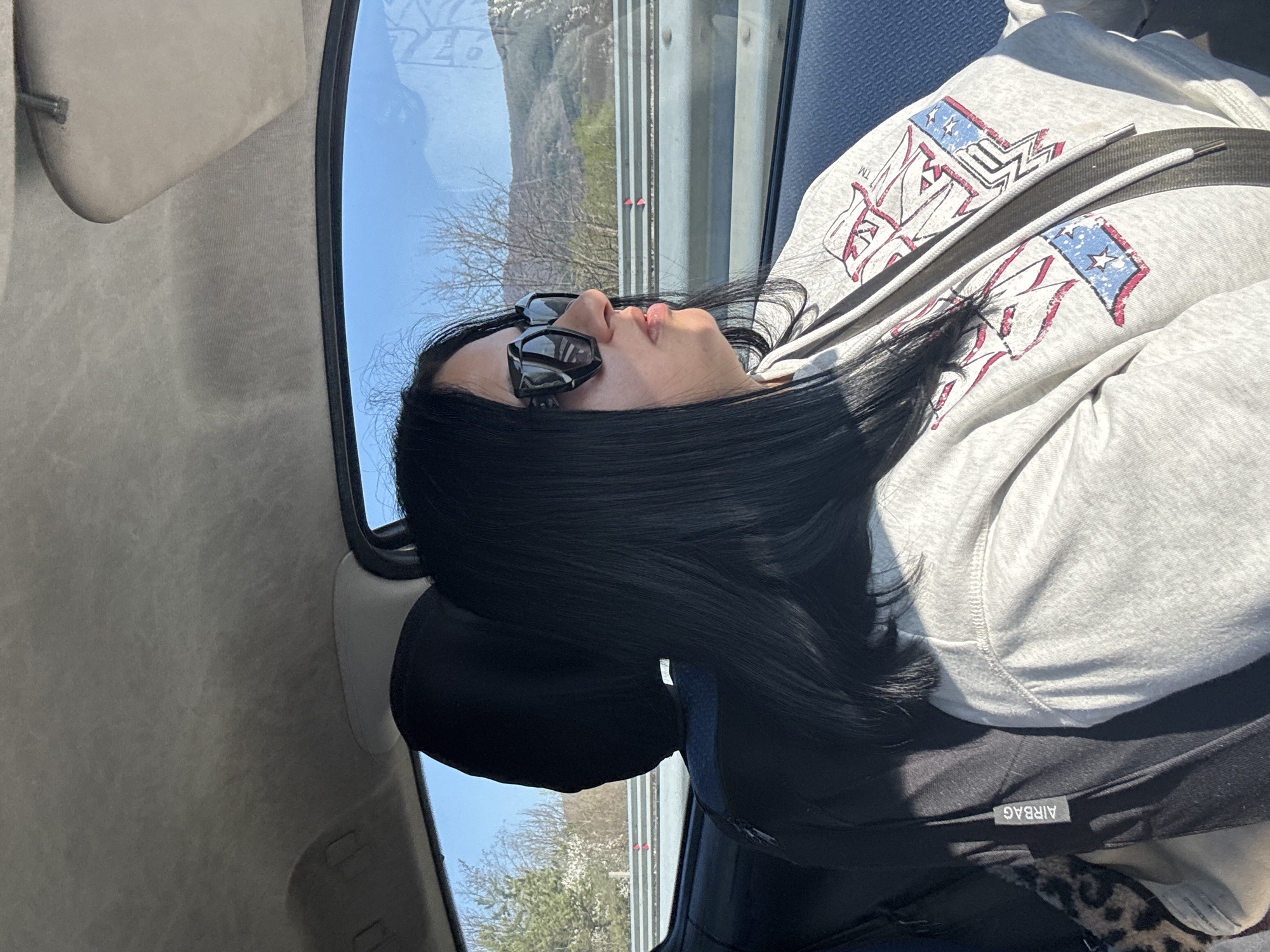 woman with long, black hair wearing sunglasses and a light gray sweatshirt with an American flag design. She is seated in a car, wearing a seatbelt. The interior of the car is visible, including the roof and a window showing a landscape with trees and what appears to be a mountain in the distance. The image doesn't provide enough detail to confirm or deny that the location is Osikovska Lakavitsa, Bulgaria.