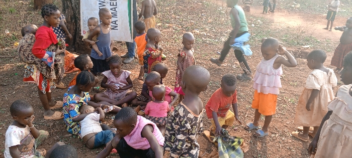 The image displays an outdoor scene in Konongo, Democratic Republic of the Congo, featuring approximately 25 to 30 individuals, predominantly children ranging from infants to pre-teens