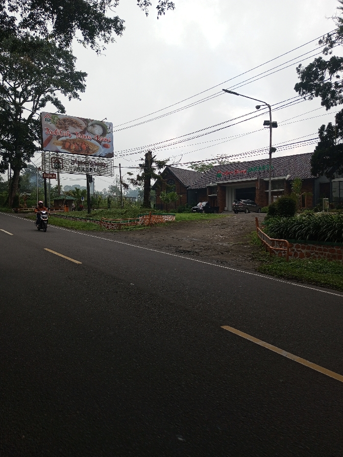 This image captures a roadside scene in the city of Sandamal Eliya, Sri Lanka, under an overcast sky. A dark asphalt road with a yellow dashed center line and a white solid shoulder line extends into the distance from the lower left. A single individual, wearing a light-colored top, operates a dark-colored motorcycle, moving away from the viewer towards the left side of the frame. To the left of the road, a large commercial billboard is elevated on poles, displaying images of prepared food, specifically a rice dish and grilled skewers. The billboard features text in a non-English script, including the phrase "Jadilah Tamu Kami" (Be Our Guest) and a smaller sign below stating "BUKA" (Open). To the right of the road, beyond a strip of green foliage and low orange-colored decorative barriers, stands a building complex with a prominent dark tiled roof and a brick-patterned facade. Green lettering, possibly identifying a business, is visible on the building's front. Two vehicles, one dark and one light-colored, are parked on a dirt/gravel lot in front of this structure. Utility poles supporting multiple overhead power lines and a streetlight are visible above the road and property. Mature trees with dense green canopies frame the scene on both the left and right, with additional distant foliage visible under the uniform grey sky.