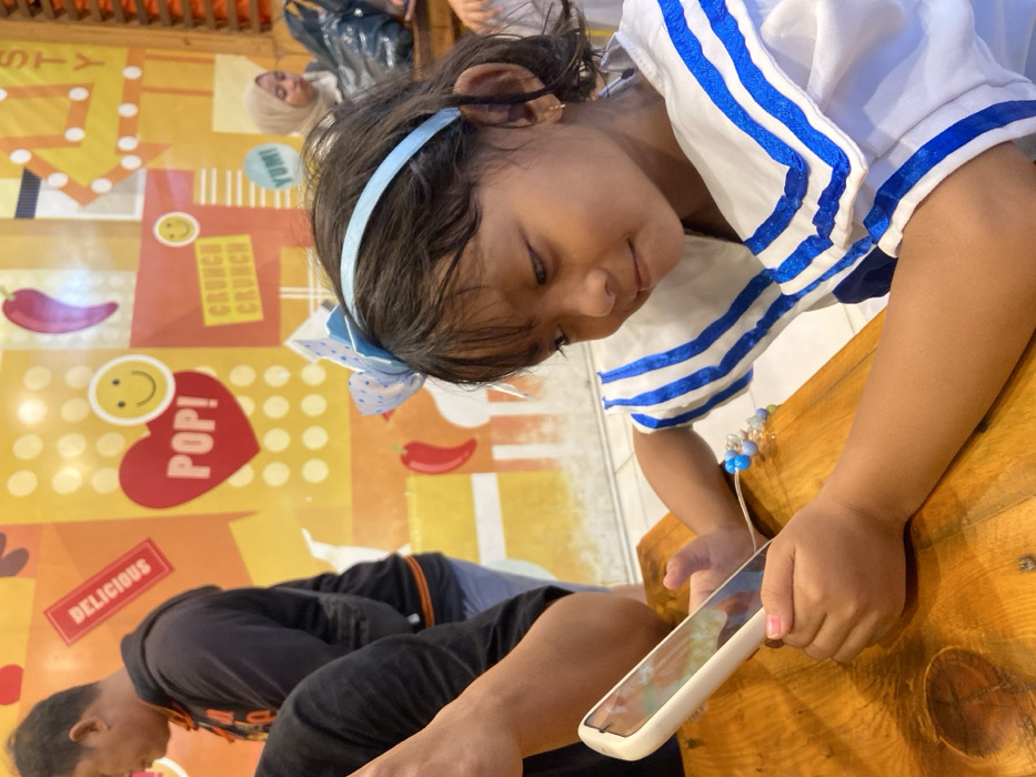 An indoor scene depicts three visible individuals and parts of a fourth, likely within a casual restaurant or eatery. The specific location within Sidoarjo, Indonesia, is not discernible from the image. In the foreground, a young girl, approximately 5-8 years old, of Southeast Asian descent, is seated at a light brown wooden table. She wears a white shirt with a blue-striped sailor collar and a light blue headband with a patterned bow. Her hair is dark, and she has a small gold earring in her right ear. She holds a white smartphone with both hands, its screen facing up and displaying content. A beaded phone charm, light blue and clear, is attached to the phone. Her gaze is directed downwards at the phone, and she exhibits a slight smile or smirk with partially open lips. To the immediate left of the girl, a partial view of an adult's arm and shoulder in a dark t-shirt is visible. In the mid-ground, an adult male, also of apparent Southeast Asian descent, stands or sits partially obscured behind the girl. He wears a dark hooded sweatshirt with an orange stripe and is looking downwards. In the background right, another female, of apparent Southeast Asian descent, wearing a light-colored hijab, is seated at a table, looking towards the right side of the frame. The background wall is brightly decorated with a yellow and orange color scheme featuring various graphic elements: two red chili peppers, a red heart with "POP!" text, yellow smiley faces, and text boxes reading "DELICIOUS," "CRUNCH CRUNCH," and "YUM!". White circular dots are patterned across the wall. A clear partition or window is visible behind the girl's head. No direct interactions between the individuals are observable; each appears to be engaged in independent activity.