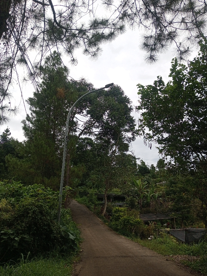 An upward-angled view captures a narrow, unpaved path winding through a densely vegetated, semi-rural landscape under an overcast sky in the city of Hasanparthy mandal, India. Dark green, pine-like branches with needles frame the top and left foreground. A tall, grey metal streetlamp pole with a curved arm and a dark fixture stands on the left side of the path. The path, composed of dark grey earth, recedes into the background, curving slightly right. Lush green foliage, including tall conifer trees on the left and various deciduous trees and bushes, lines both sides of the path. On the right, a tree exhibits numerous dark, elongated, pendulous pods or fruits. Further into the background on the right, low-lying structures or cultivation areas are visible, partially covered with black mesh or tarpaulin. No individuals or animals are present.