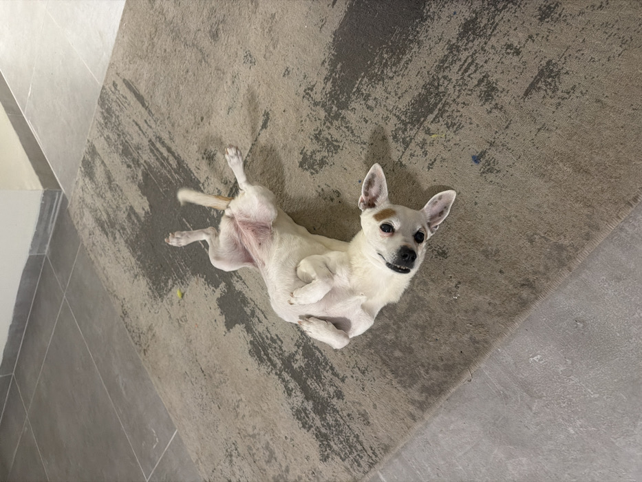 - "An indoor scene in Nahariyya, Israel, depicts a small, white-furred dog lying on its back on a rectangular, light brown and grey patterned rug" by FM-nFXPN2, licensed under CC BY 4.0
