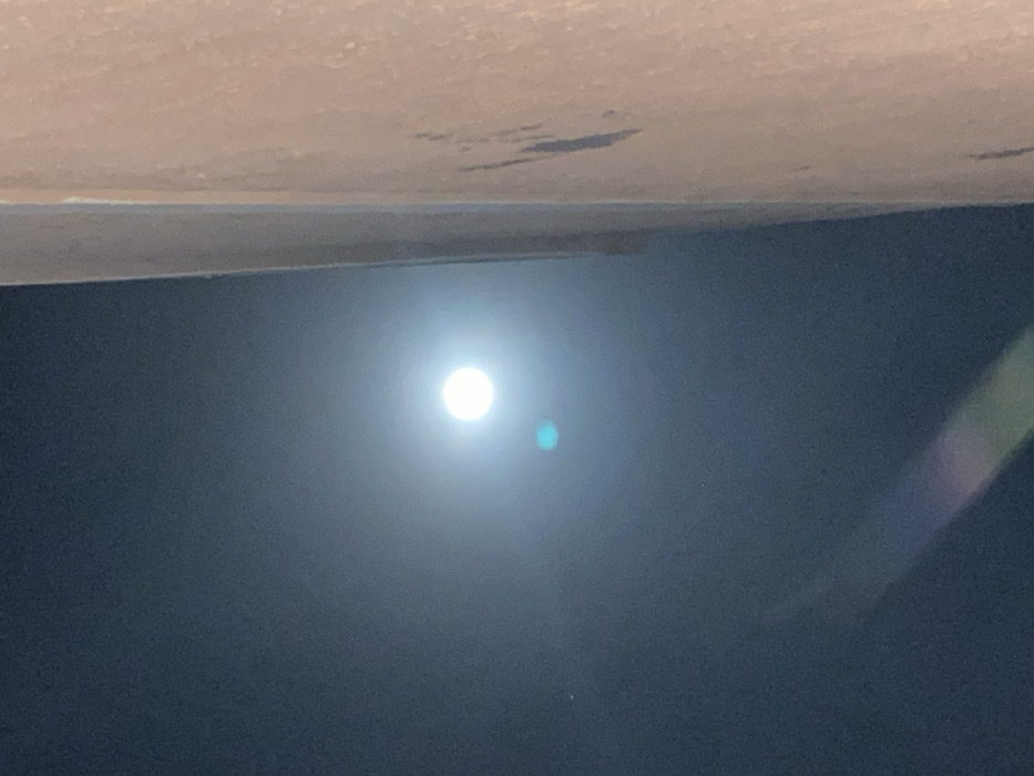 The image depicts a night scene in Dabawa, Nigeria. A prominent, bright, circular light source, consistent with a full moon, is situated in the upper-middle portion of the dark sky. A distinct teal lens flare is visible directly below the main light source, and faint multicolored lens flare streaks extend diagonally from the bottom-left towards the center. A light-colored, vertical architectural element, appearing to be a building facade or wall, occupies the right side of the frame, angled slightly inward. The surface of this structure displays some dark, irregular discoloration. No human figures or specific street-level details are discernible within the frame.
