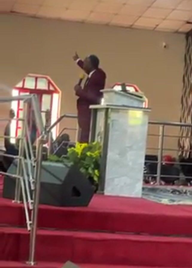 A man in a maroon suit is standing on a stage at a podium. He is holding a microphone in his left hand and raising his right hand in the air. The stage has red carpeting and a metal railing. There is a potted plant next to the podium, and speakers on the floor. The room is large with a high ceiling. There are other people on the stage, including one raising a hand.